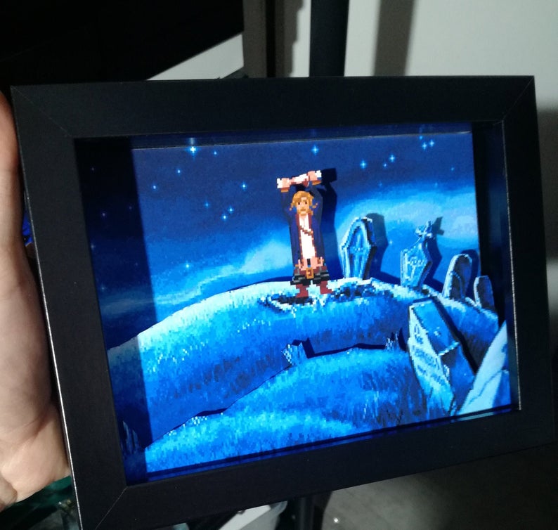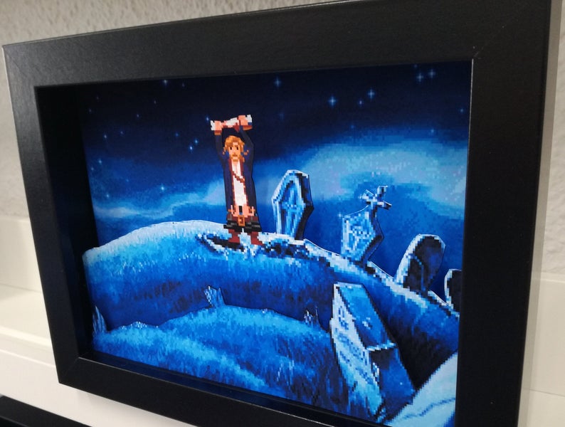 Diorama inspired by Monkey Island 2 video game, made with high quality digital printing with photographic paper and hand cut, all mounted in a black frame.